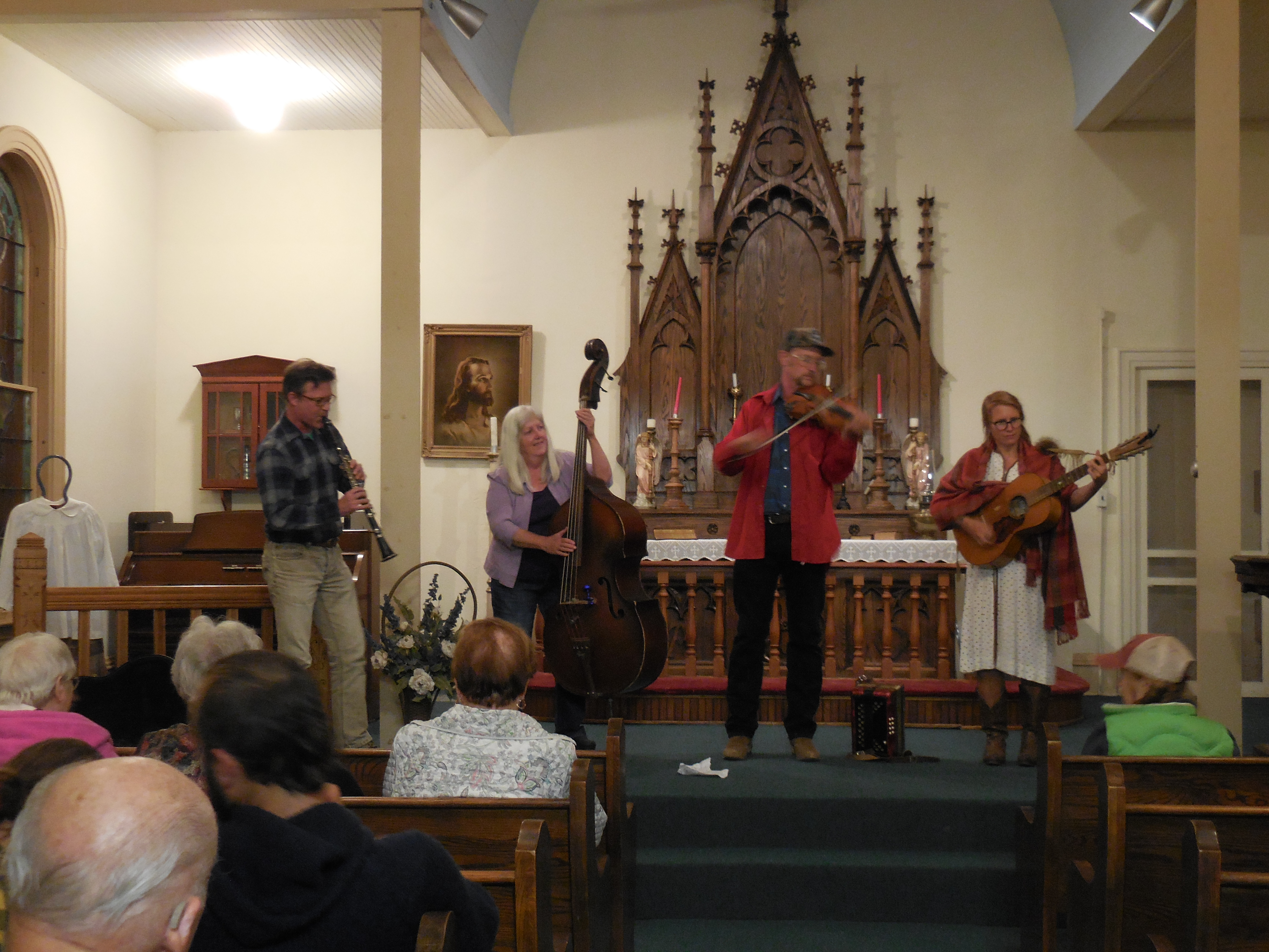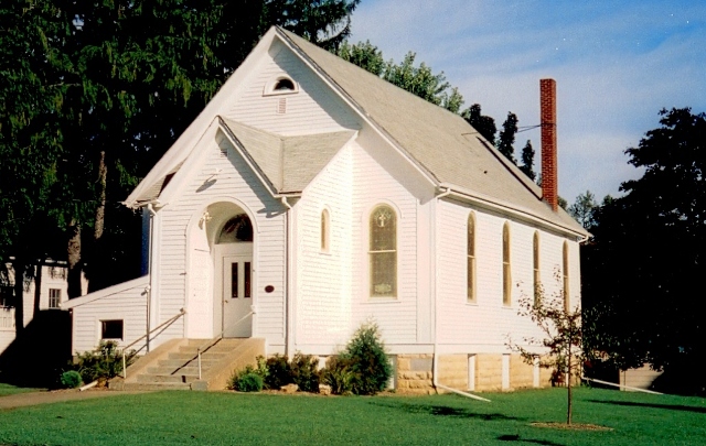 The historic St. Mary’s Church building, 606 W. Broadway, is now a beautiful venue for a small wedding or other ceremony, concert, lecture, etc. The main floor consists of a vestibule and sanctuary, which is furnished with wooden pews. Additional stacking chairs are available. An outside door leads up narrow steps to the balcony, which can also hold chairs. Two toilets are available in the basement, accessed through another outside door. Please note that there is street parking only at the church, and that this building is not handicapped-accessible – there are 7 steps up to the main floor.
