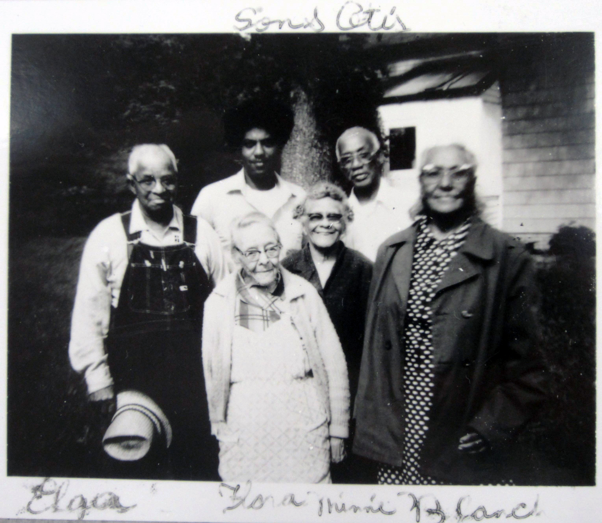 Shivers home in Hillsboro, with Alga and Flora Shivers and Blanche (Bass) Arms in front, possibly Minnie Owens in middle, Cecil and Otis Arms in back.