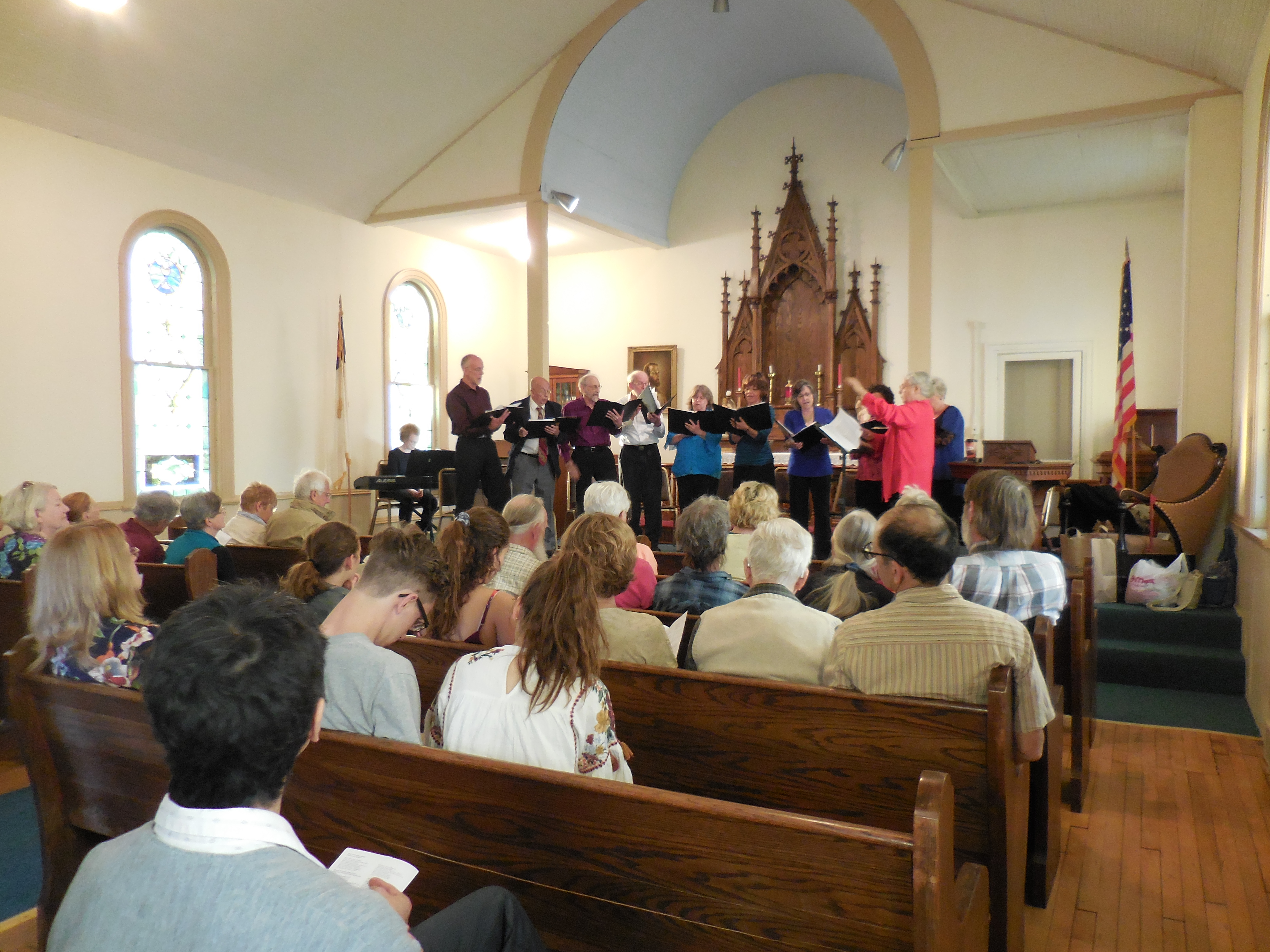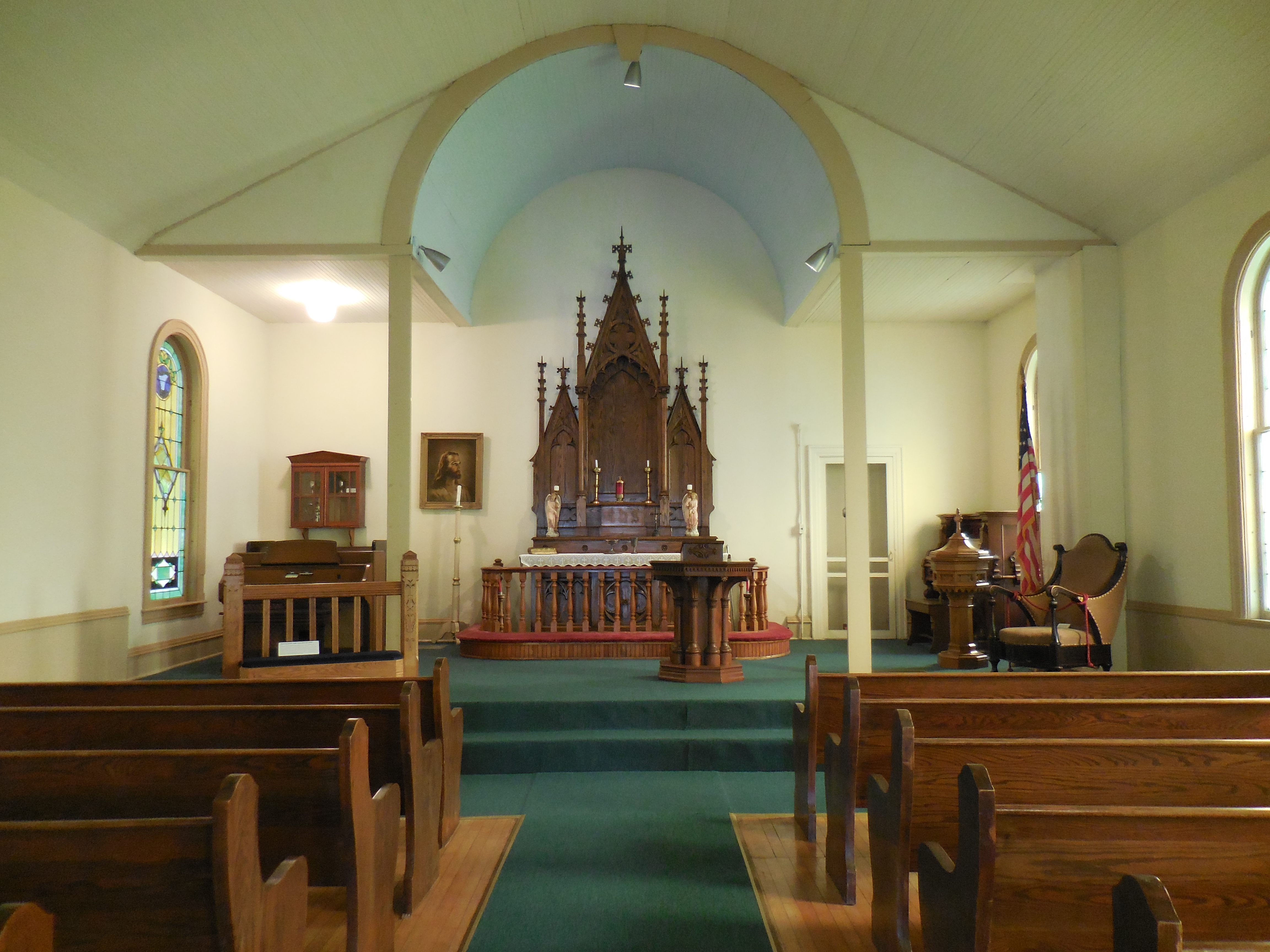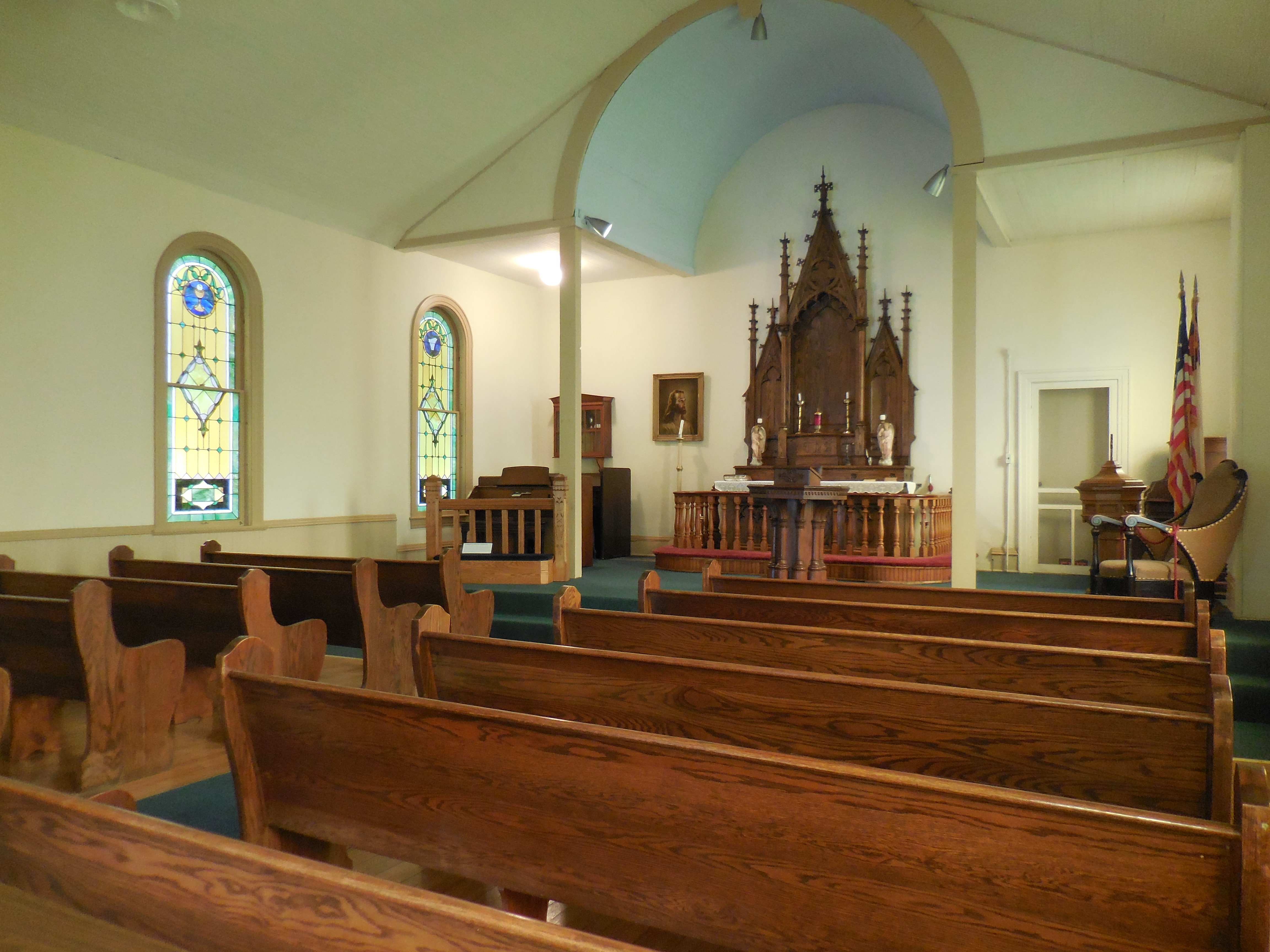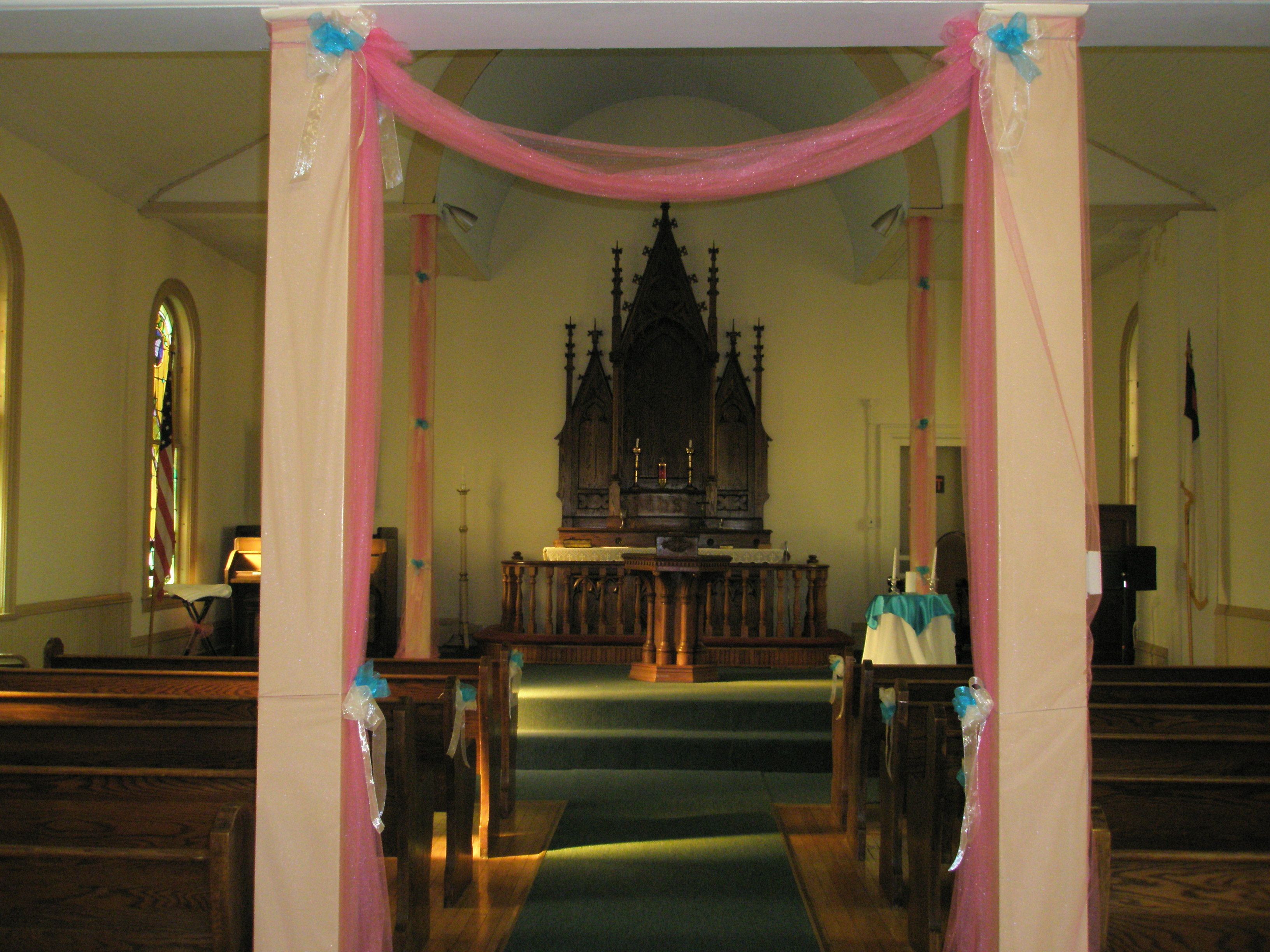 The historic St. Mary’s Church building, 606 W. Broadway, is now a beautiful venue for a small wedding or other ceremony, concert, lecture, etc. The main floor consists of a vestibule and sanctuary, which is furnished with wooden pews. Additional stacking chairs are available. An outside door leads up narrow steps to the balcony, which can also hold chairs. Two toilets are available in the basement, accessed through another outside door. Please note that there is street parking only at the church, and that this building is not handicapped-accessible – there are 7 steps up to the main floor.